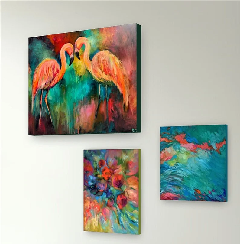 Combining vibrant animal paintings with abstract or floral pieces can add depth and personality to a space. For example, a large expressive heron painting will draw the eye, while a smaller coral-toned abstract or a loose floral adds softness and movement nearby. Choosing artworks with shared colours – like pops of turquoise, coral pinks, or sunny yellows – helps tie everything together without being overly matchy.