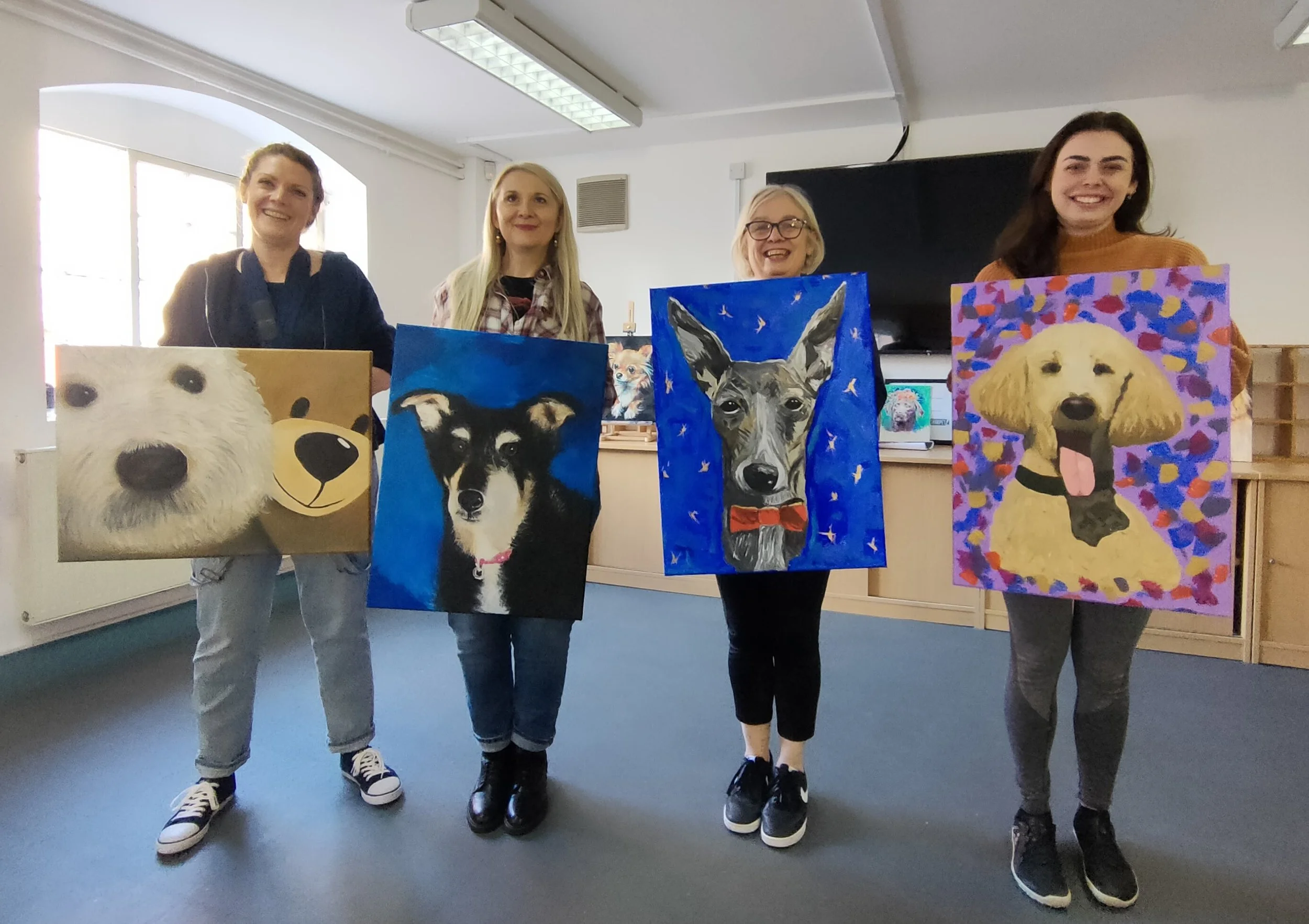 A group of adults participating in a painting class, sitting at tables with easels, painting colorful landscape canvases. Some are standing and working on their artwork, others are seated focusing on their paintings. The room has bulletin boards and a window letting in natural light.